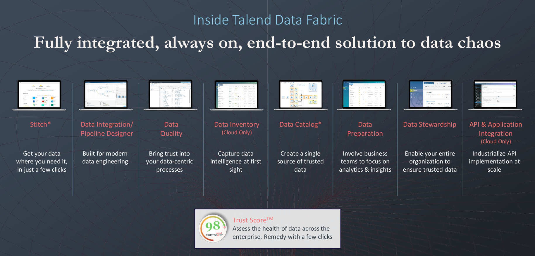 Talend es una plataforma que cubre todo el proceso de ingesta, data quality, tratamiento y gobierno del dato.