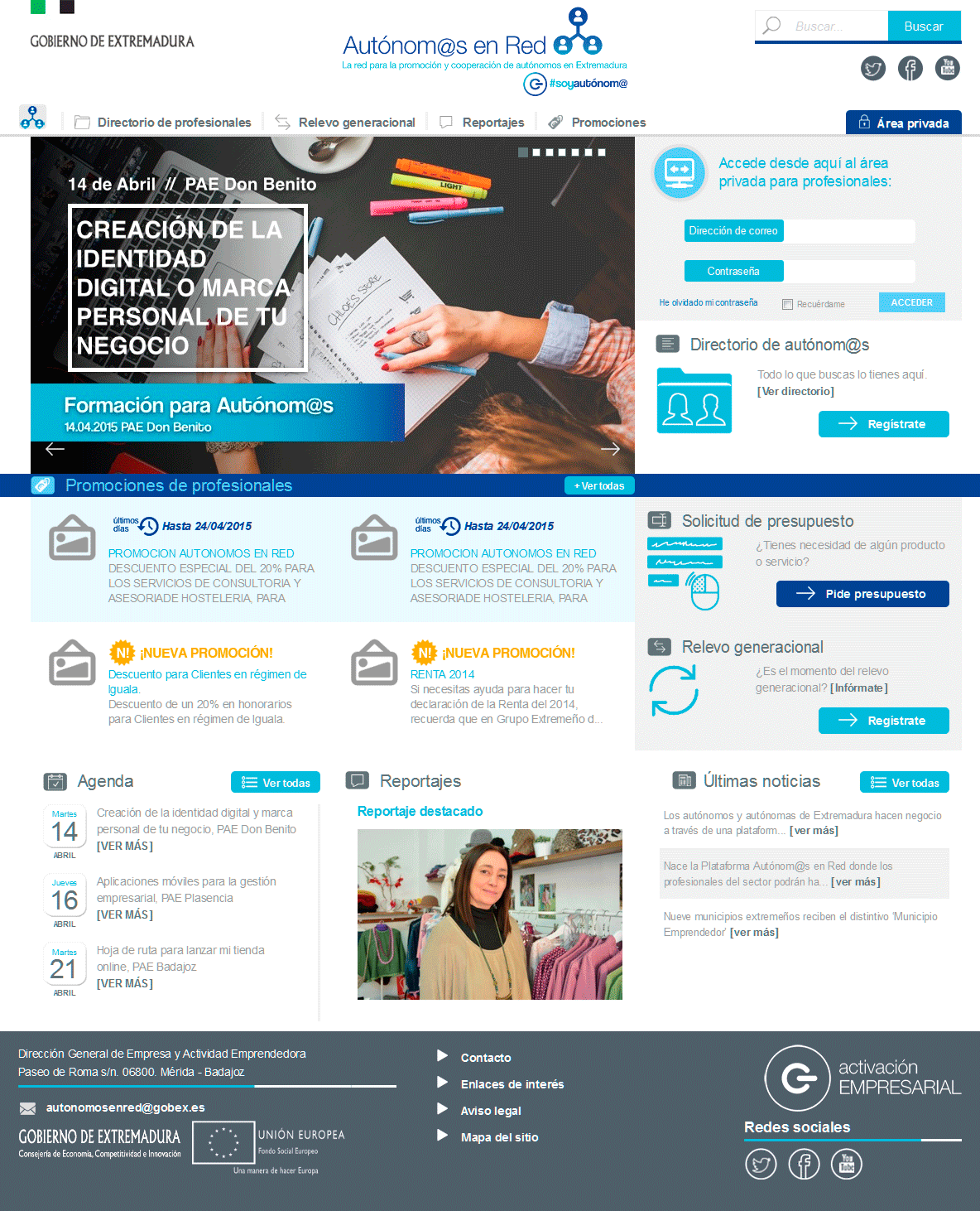 Autónom@s en Red es un espacio online de referencia para autónom@s en Extremadura donde generar relaciones con otras empresas, buscar proveedores y clientes, así como hacer networking e iniciar proyectos de colaboración. La plataforma cuenta con un potente buscador, además de un espacio privado para el contacto y el desarrollo de proyectos de colaboración entre los miembros de la Red.